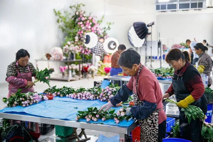 浙江省金华市浦江县杭坪镇乌浆村鲜花基地内,工人们正在分拣打包鲜切花。