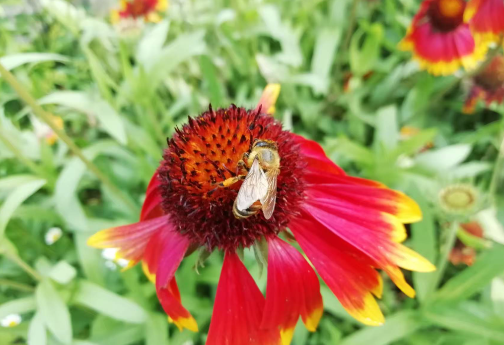 作品简介:拍摄于成都郊外花田,以一朵盛放的天人菊(Gaillardia)为核心,捕捉了蜜蜂在花盘上忙碌采蜜的瞬间。火红的花瓣边缘镶着明亮的金黄色,与深褐带橙的花盘形成浓烈色彩对比,背景是清新的绿色草丛,整体画面充满了生机与自然野趣。
