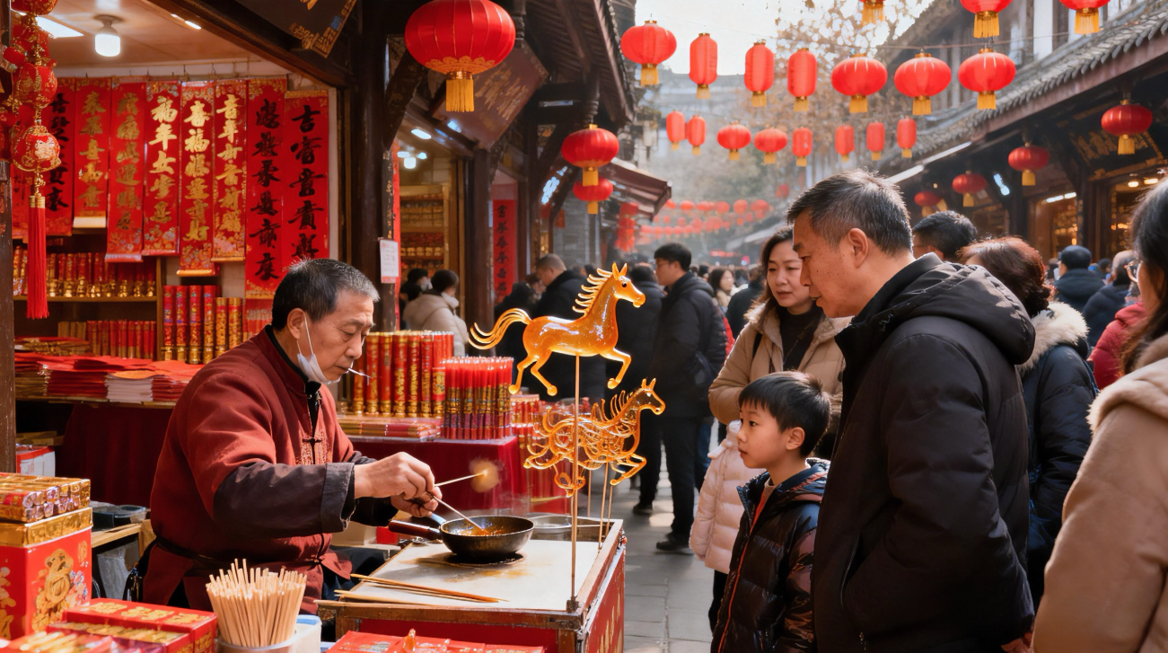 作品简介:聚焦四川春节前夕的年货市集,以国家级非遗“成都糖画”为核心载体,捕捉传统技艺在当代市井中的鲜活瞬间。画面中,老艺人专注地以勺为笔、以糖为墨,熬制的金黄糖稀在石板上勾勒出灵动的“金马” 造型,不仅是匠心的体现,更暗合2026马年新春的吉祥寓意。