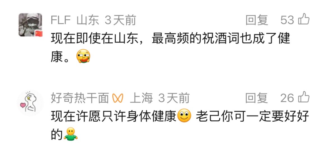 健康福的火爆也反映出,大家真的是越来越重视健康了。全家人身体健康,成为中国人最朴素的新年愿望和祝福。山东网友:即使在山东,健康也成为了最高频的祝酒词。