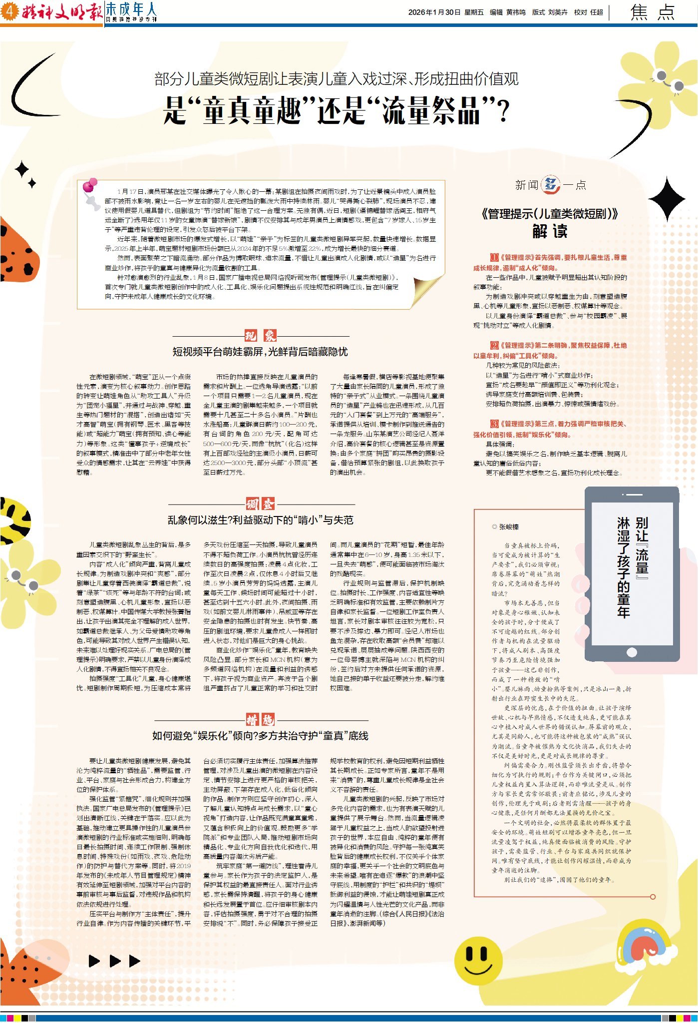儿童类微短剧的兴起,反映了市场对多元化内容的需求,也为有表演天赋的儿童提供了展示舞台。然而,当流量逻辑凌驾于儿童权益之上,当成人的欲望投射进孩子的世界,本应自由、纯粹的童年便有被异化和消费的风险。守护每一张纯真笑脸背后的健康成长权利,不仅关乎个体家庭的幸福,更关乎一个社会的文明底色与未来希望。唯有在追逐“爆款”的浪潮中坚守底线,用制度的“护栏”和共识的“堤坝”抵御利益的侵蚀,才能让萌娃短剧真正成为闪耀温情与人性光芒的文化产品,而非童年消逝的注脚。(综合《人民日报》《法治日报》、澎湃新闻等)