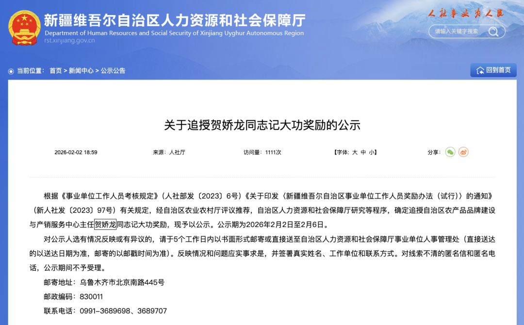 2月2日,新疆维吾尔自治区人力资源和社会保障厅在官网发布了“关于追授贺娇龙同志记大功奖励的公示”,公示期至2月6日。