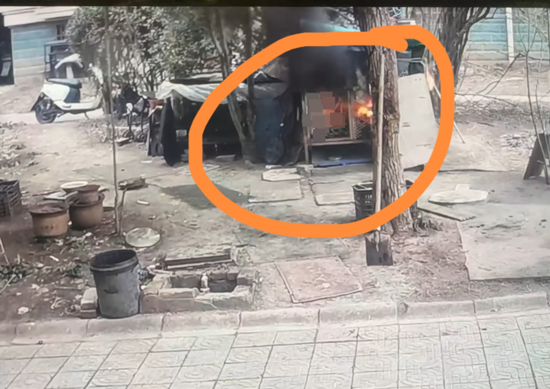 12时35分40秒左右,两个小男孩再次来到狗笼外,共同点燃一支烟花,这时狗笼内的烟稍大,他们观望后没有再将烟花扔进笼内。随后,黑衣小男孩拿着烟花去追一只鸡,白衣小男孩在狗笼外观察后大叫“着火了”。