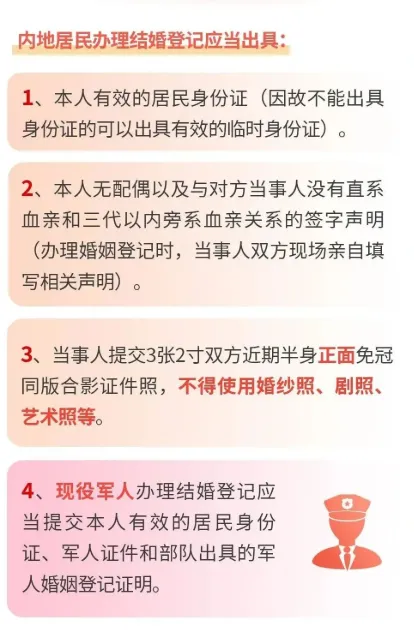 此次延时服务时间为2月21日(正月初五)至2月23日(正月初七),可办理各项内地居民婚姻登记业务。双方均为内地居民的新人,可选择全市任意提供延时服务的登记点办理。涉一方是内地居民,一方是外国人、港澳台居民或华侨的婚姻登记,需前往四川天府新区红梁湾公园婚姻登记处办理。