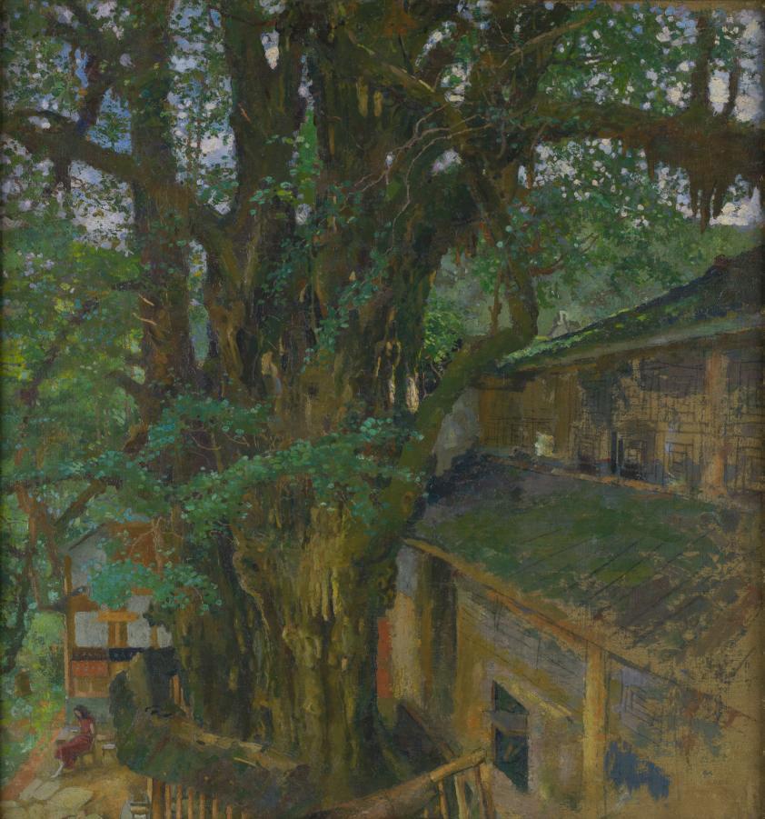 《天师洞银杏树》和《读》两件布面油彩均创作于1943年的四川,其与《群奔》《奔马》等作品均为首次来川展出。《天师洞银杏树》和《读》画面中都有徐悲鸿当时的恋人、后来的妻子廖静文,描绘了他们在蜀地生活的时光。
