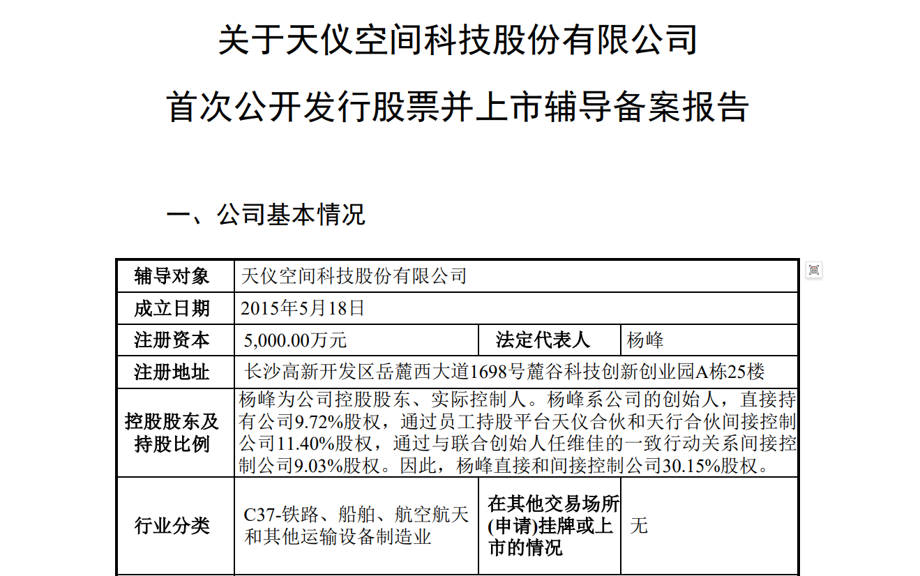 据上市辅导备案报告,杨峰为公司控股股东、实际控制人,直接持有公司9.72%股权,通过员工持股平台天仪合伙和天行合伙间接控制公司11.40%股权,通过与联合创始人任维佳的一致行动关系间接控制公司9.03%股权。因此,杨峰直接和间接控制公司30.15%股权。
