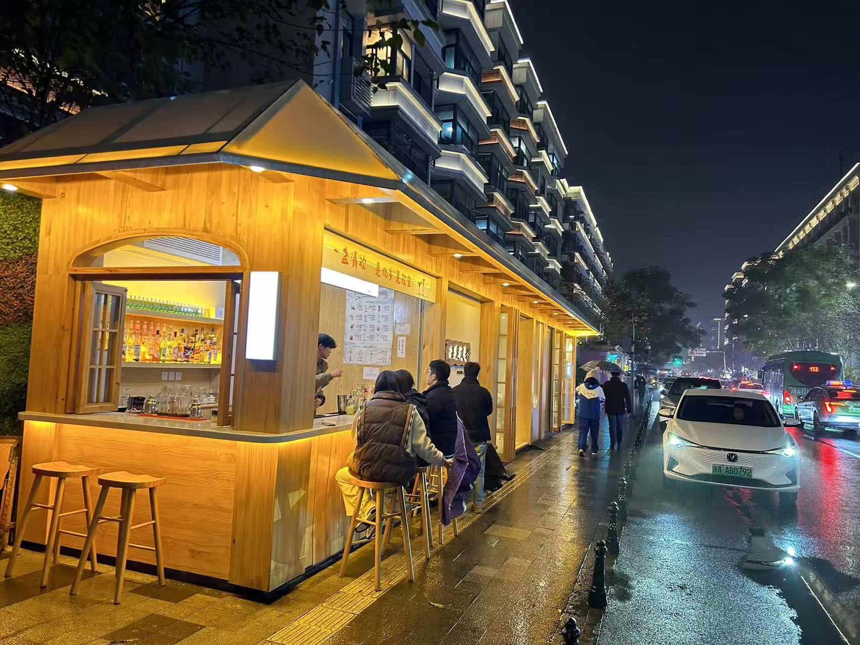 吧台上,青花瓷杯盛着“青玉恋”特调热白酒,伴着一缕热气递到客人手中,诗意与酒香交织,成为夜色里玉林路的独特风景。