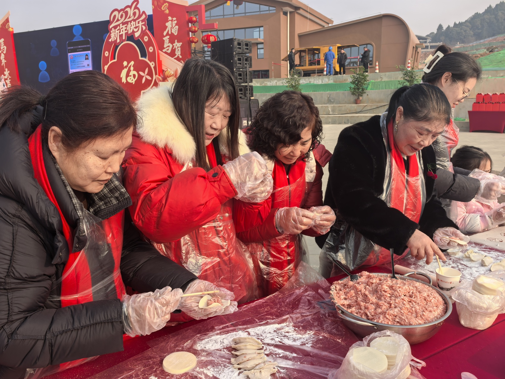 往日安静的广场装点起红灯笼,父母、子女围坐桌旁拉着家常。外围区域,有人包饺子、写春联、舞龙狮、备菜忙活……小小的广场漾开一片欢声。屏幕那头,儿女们正在厂里忙着张罗川闽风味的团圆饭。
