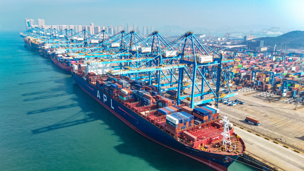2月4日,集装箱货轮在山东港口青岛港全自动化码头装卸货物(无人机照片)。