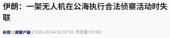 当地时间2月3日晚,总台记者获悉,伊朗方面一名消息人士表示,伊方一架无人机当天在公海执行常规合法侦察任务过程中失联,但已成功传回其拍摄的图片。