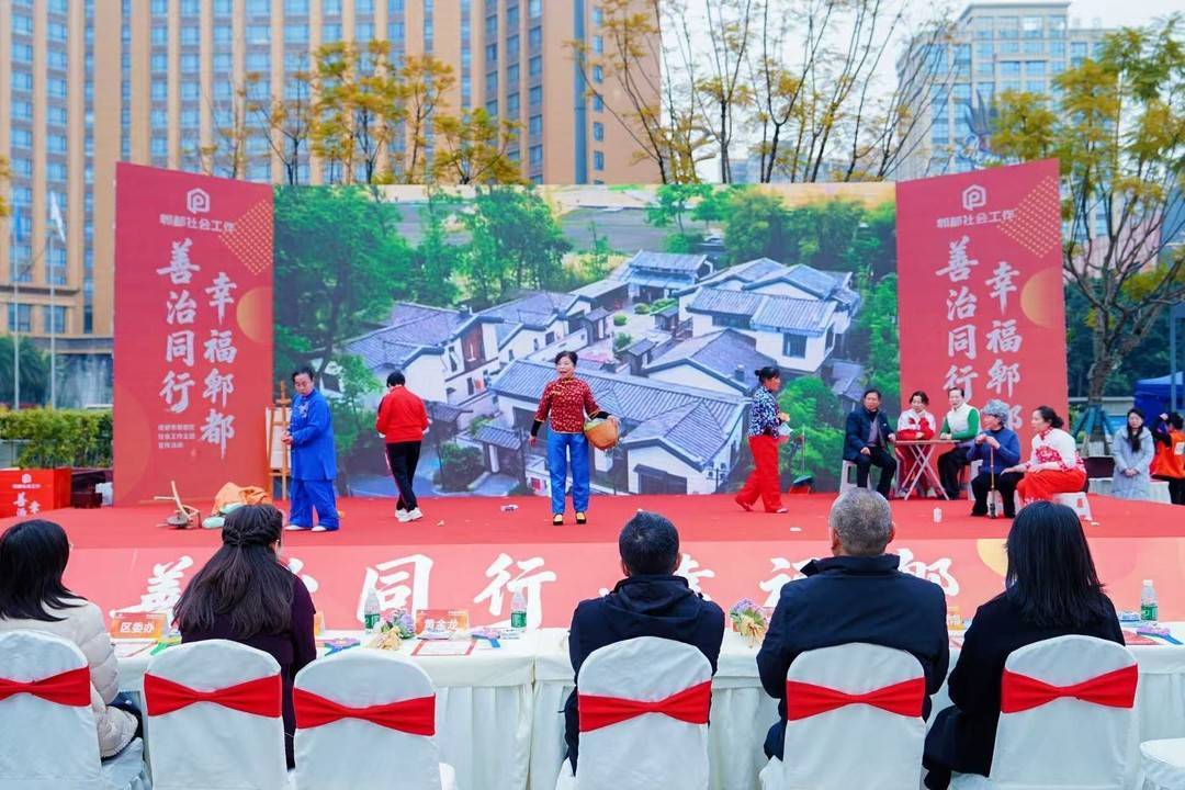 舞台上,节目精彩纷呈,情景剧《家园“信”事》深情演绎了“信义赋能治理”;《美好家园新画面》描绘出“共治扮靓乡村”;朗诵《微光成炬·幸福郫都》用诗意的语言勾勒出治理诗篇、向城市的奔跑者和守望者致敬;《社会工作者星光秀》则展现了社会工作者们自信昂扬的精神风貌;原创歌曲《给你的歌》唱出了志愿者坚守初心的温暖与感动。