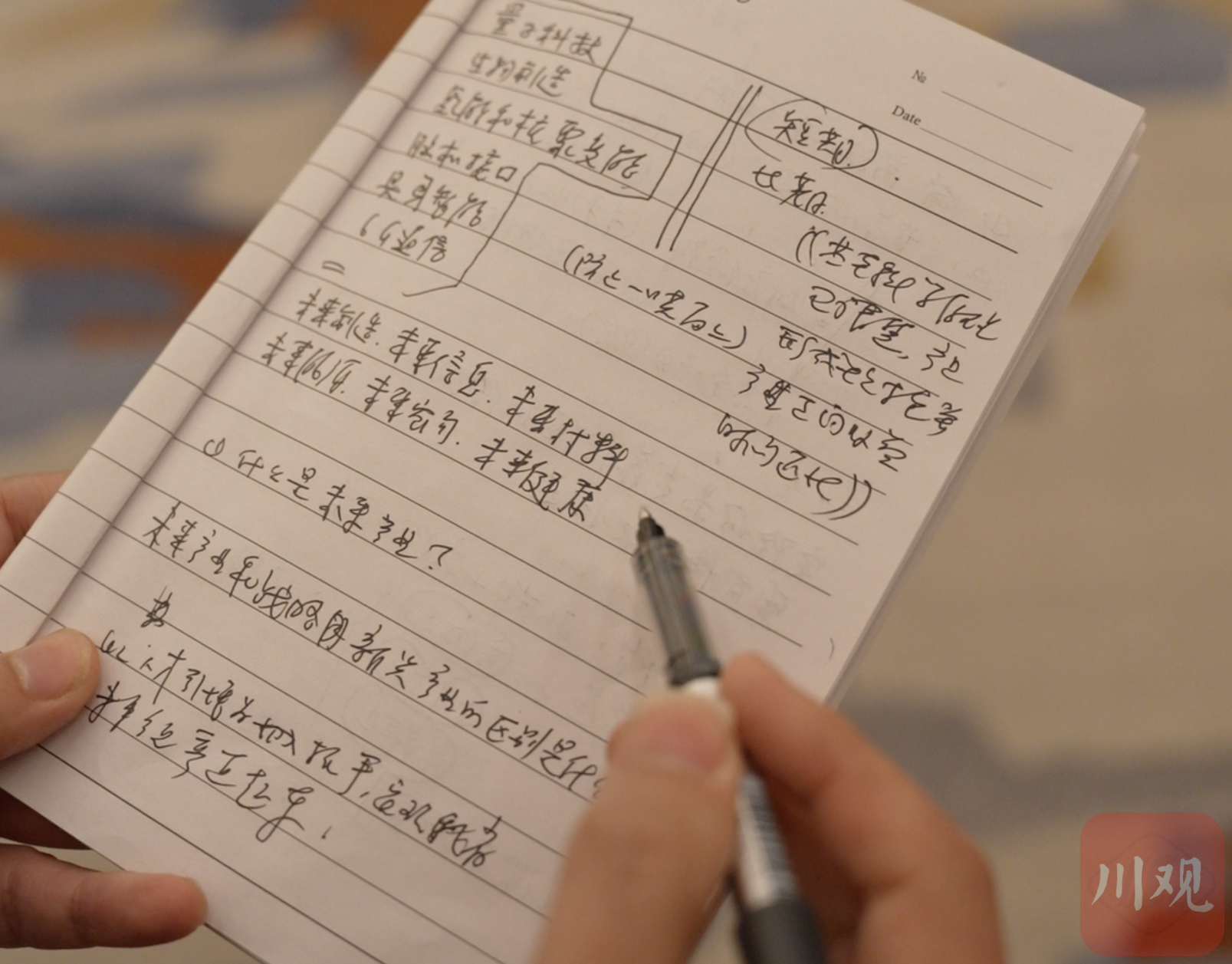 笔记本中间,一个问句格外醒目:“未来产业和战略性新兴产业的区别是什么?”经过深思,他在下方给出了自己的“解法”:未来产业技术转化链条长、商业化前景不确定,传统“重项目、重投资”的模式可能不再完全适配。而突破口在于“人才”——“要以人才突破带动技术突破,让最强大脑留下来、扎下根,四川发展才有持续动力。”