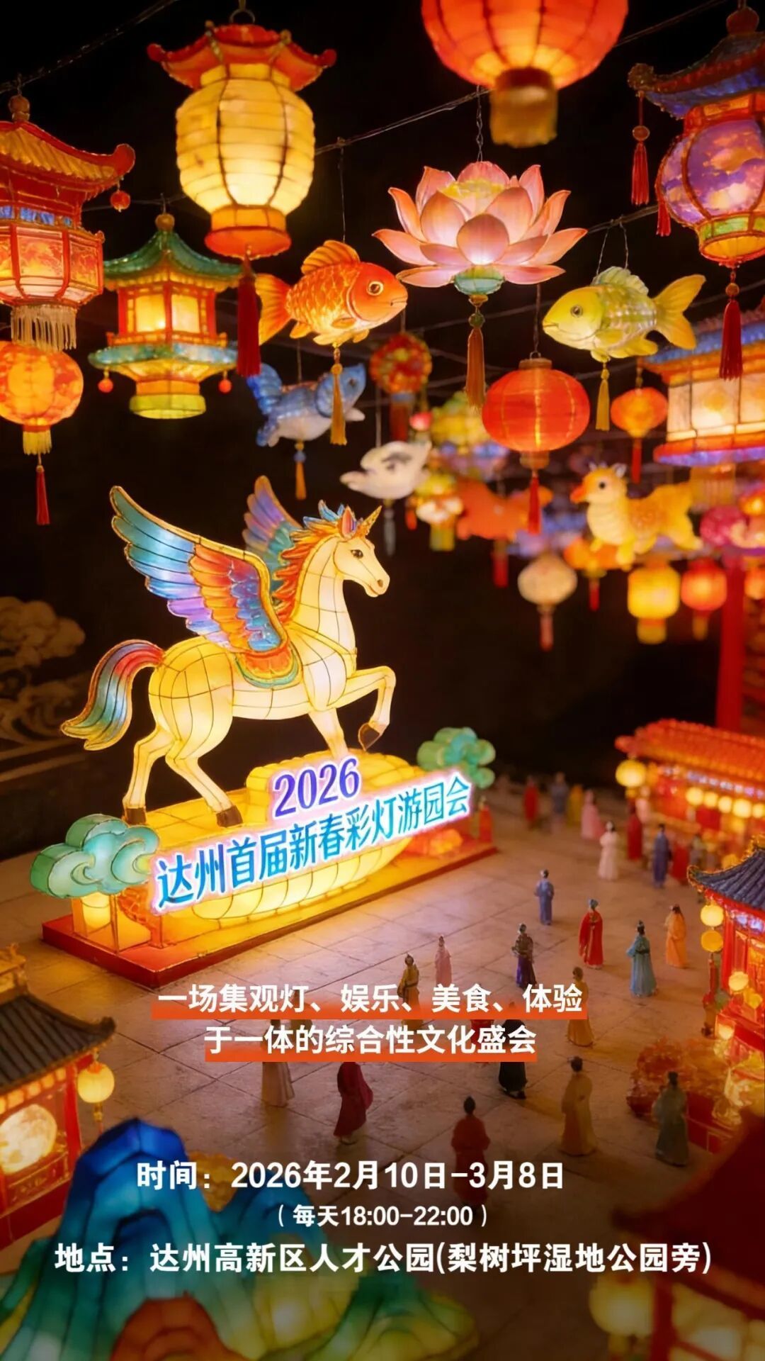 这个新年,达州的夜色将被这场光影盛宴温柔点亮。2026年春节期间,达州高新区人才公园(梨树坪湿地公园旁)将举办首届新春彩灯游园会。这是一场集观灯、娱乐、美食、体验于一体的综合性文化盛会,惠民价邀你漫步灯河,感受最传统地道的新春风情。