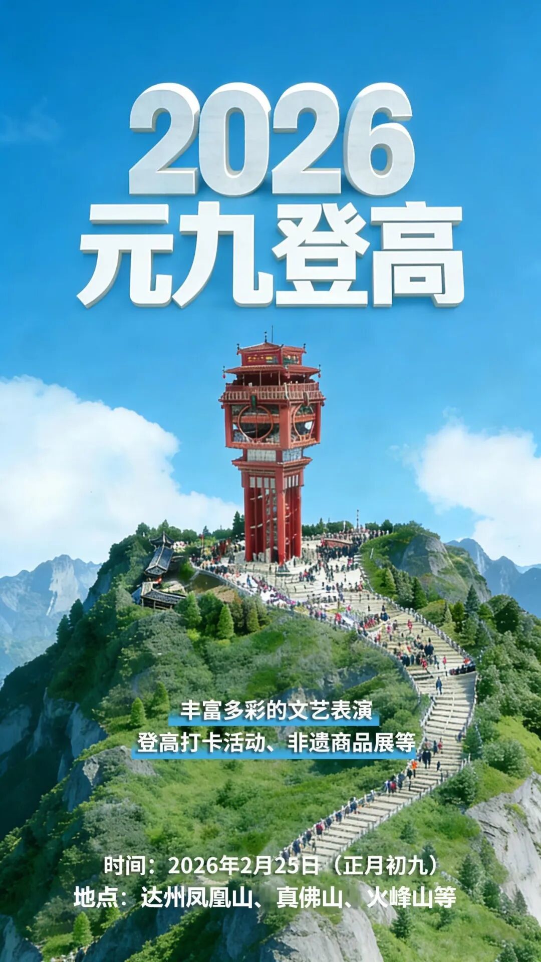 大年初九,达州人有一个延续百年的传统——登高祈福。这不仅是一项民俗,更是对新一年“步步高升”的美好祝愿。2026年2月25日(正月初九),凤凰山、真佛山、火峰山等山上将格外热闹。除了市民自发的登高活动,现场还有丰富多彩的文艺表演、“寻迹元九”文化NPC互动打卡活动以及非遗商品展,让新年祝福更具仪式感。