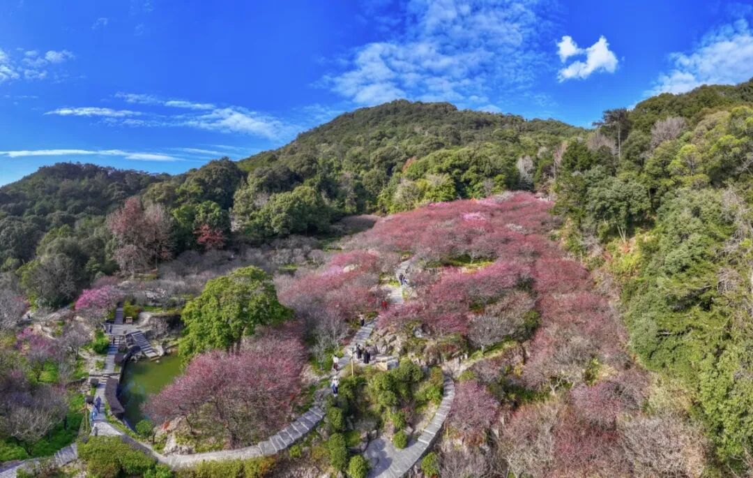 鼓山梅里迎来梅花绽放的时节,作为福州市区规模最大的赏梅地,山坡间数千株梅花层层铺展,粉红如霞,散发着早春的浪漫气息。