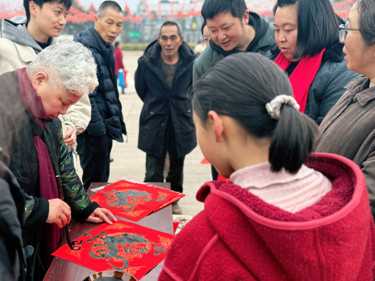 这场创意书写,是芦山县委宣传部主办的2026年度送文化科技卫生“三下乡”系列活动的一部分。当天,多家单位同步开展了义诊、农技科普、文艺演出等服务。卫生健康展台前,医生正耐心解答咨询;科普服务区里,农业、健康、非遗等知识讲解吸引了不少人驻足;舞台区域,节目表演引来阵阵掌声。但格外聚拢人气的,仍是那几处笔墨飞舞的书写台。