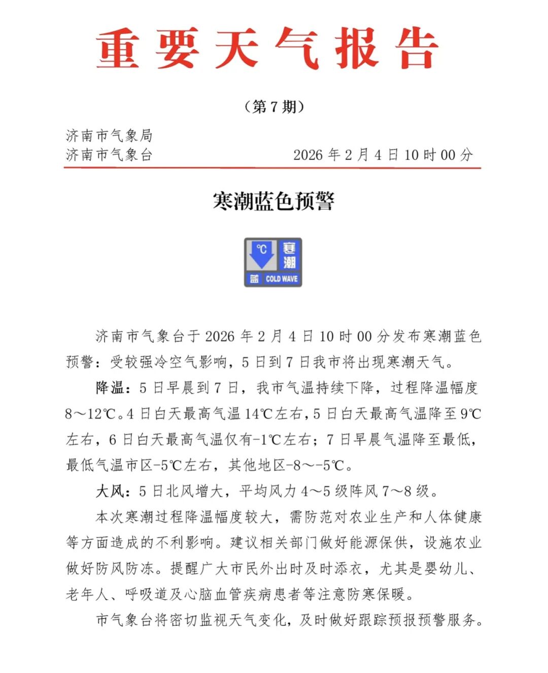 受较强冷空气影响,预计5日到7日我市历下区、市中区、槐荫区、天桥区、历城区、南山区和起步区全部街道将出现寒潮天气。气温明显下降,过程降温幅度8~12℃,个别街道可达14℃。6日最高气温-1℃左右,7日早晨气温降至最低,南山区和起步区-8℃左右,历下区、市中区、槐荫区、天桥区和历城区-5℃左右。此外,5日至6日白天有平均风力4~5级阵风7~8级的偏北风。为此,济南市气象台于2026年02月04日16时30分发布寒潮蓝色预警信号,请注意防范。