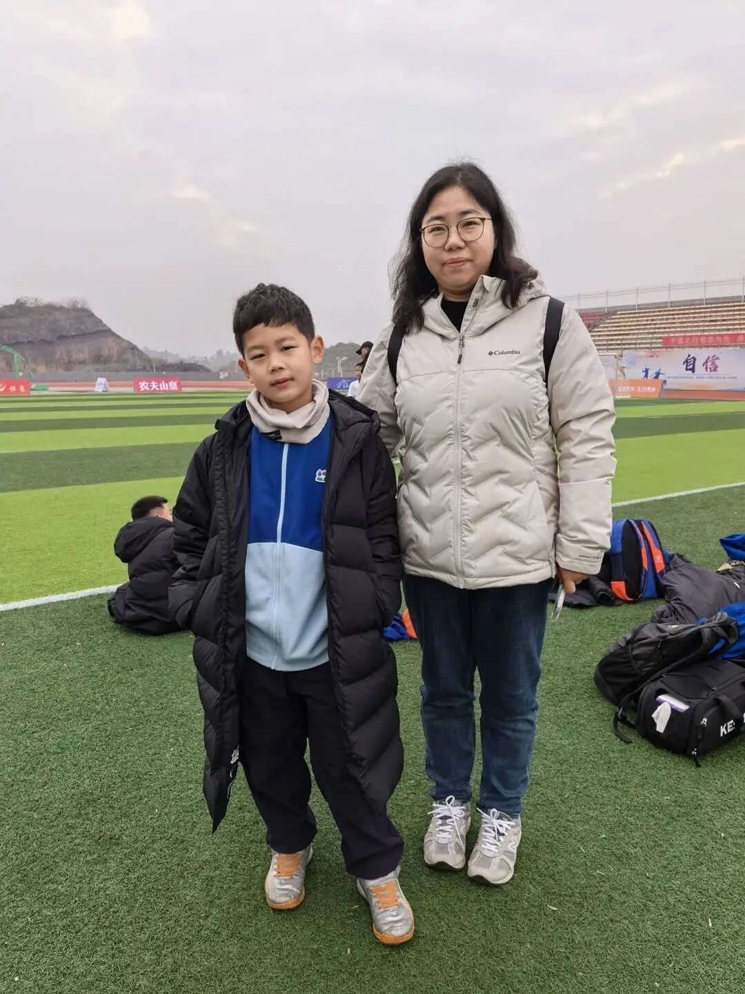 武汉星空U8小球员夏一航(左)与妈妈冯昕(右)。