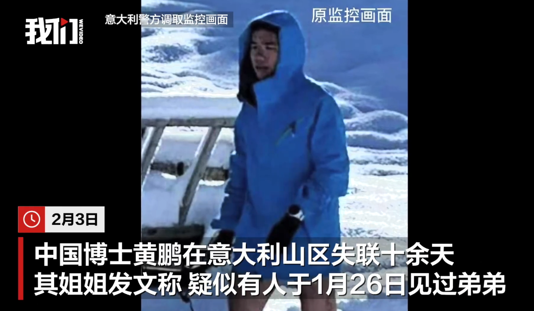 据新京报消息,2月3日,中国博士黄鹏在意大利山区失联十余天,其姐姐发文称,疑似有人于1月26日见过弟弟。2月4日,黄鹏姐姐告诉记者,有人在奥德尔看到疑似黄鹏的男子用手机付款购买了咖啡。