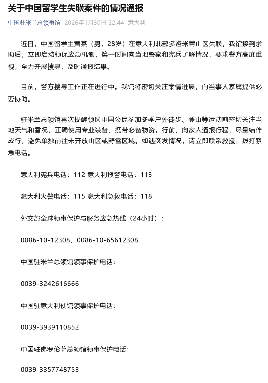 1月30日晚,中国驻米兰总领事馆就中国留学生失联案发布情况通报: