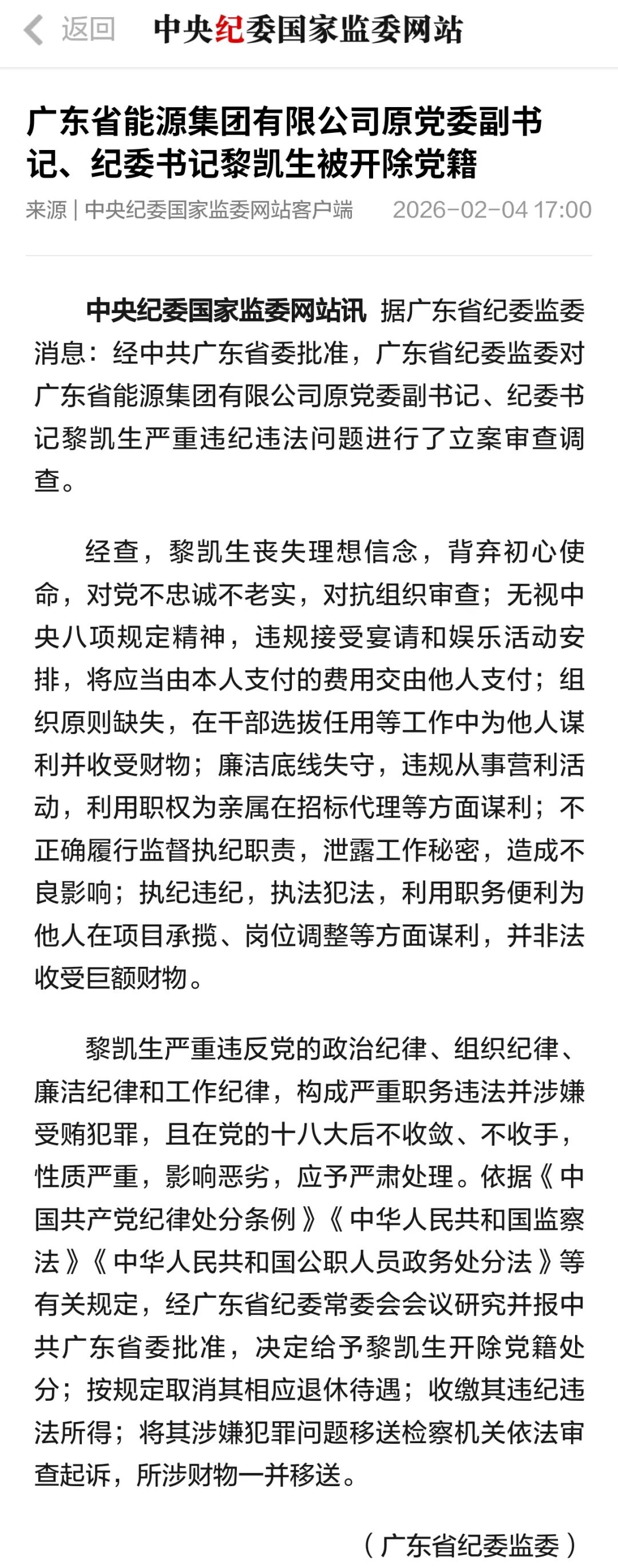中央纪委国家监委网站消息:据广东省纪委监委消息:经中共广东省委批准,广东省纪委监委对广东省能源集团有限公司原党委副书记、纪委书记黎凯生严重违纪违法问题进行了立案审查调查。