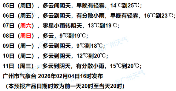 广州市气象台预计,2月5日—6日广州云量较多,早晚有轻雾,其中2月6日有分散小雨。2月6日夜间—8日受中等强度冷空气影响,广州零星小雨转多云,冷空气影响过程降温幅度5~7℃,陆地阵风加大至5~7级,港区和高地阵风7~9级。2月7日广州最高气温将降到“1字头”。