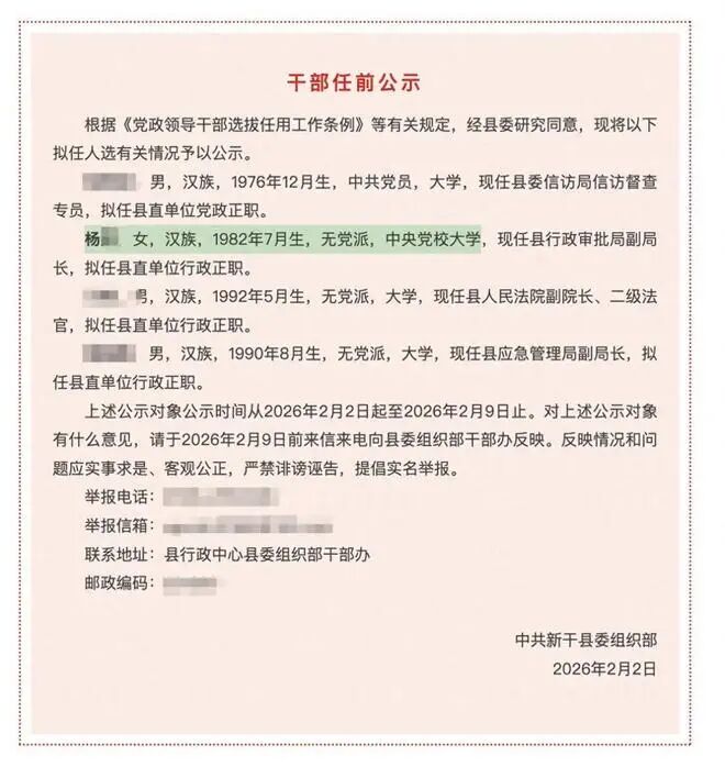 2月2日,江西省吉安市新干县委组织部发布一则干部任前公示,其中提到现任县行政审批局副局长杨某,拟任县直单位行政正职。