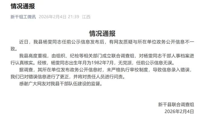 我县高度重视,由组织、纪检等相关部门成立联合调查组,对杨雯同志干部人事档案进行认真核实。经核,杨雯同志出生年月为1982年7月,无党派,任前公示信息无误。