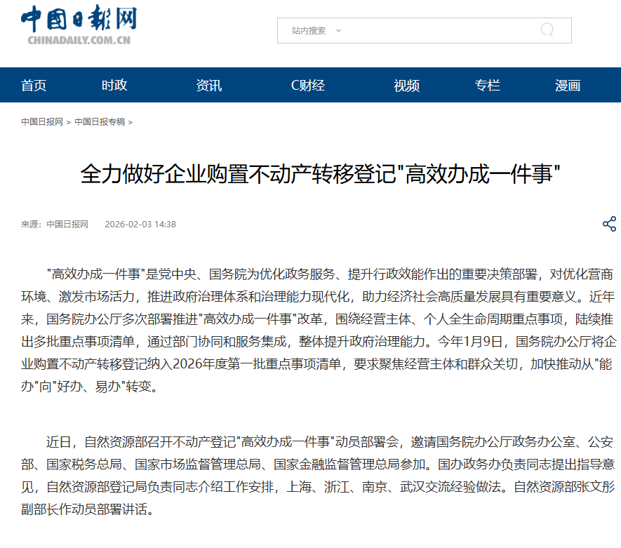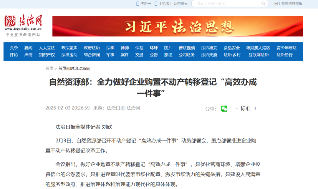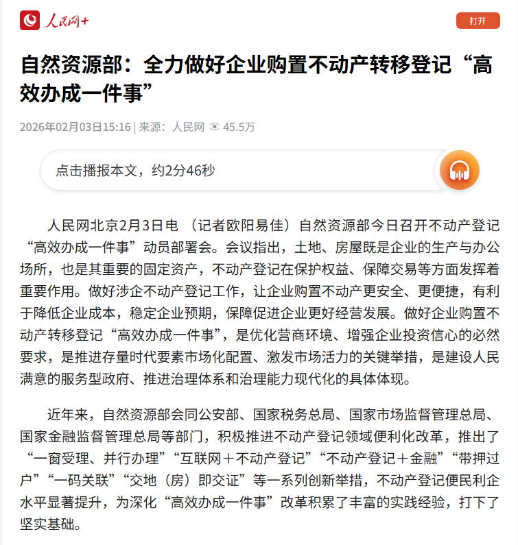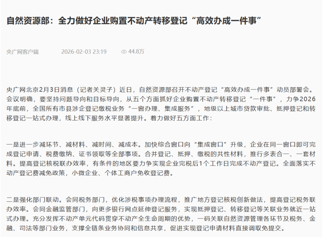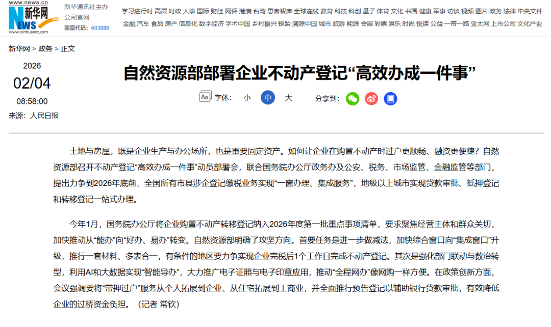 近日,自然资源部召开不动产登记“高效办成一件事”动员部署会,联合国务院办公厅政务办及公安、税务、市场监管、金融监管等部门,提出力争到2026年底前,全国所有市县涉企登记缴税业务实现“一窗办理、集成服务”,地级以上城市实现贷款审批、抵押登记和转移登记一站式办理。《人民日报》、人民网、人民网客户端、新华网、央广网、央广网客户端、《光明日报》客户端、中国日报网、中国新闻网、中国网、法治日报-法治网、《工人日报》客户端、《经济参政报》、澎湃客户端等媒体进行了报道。