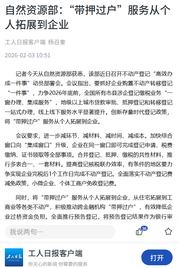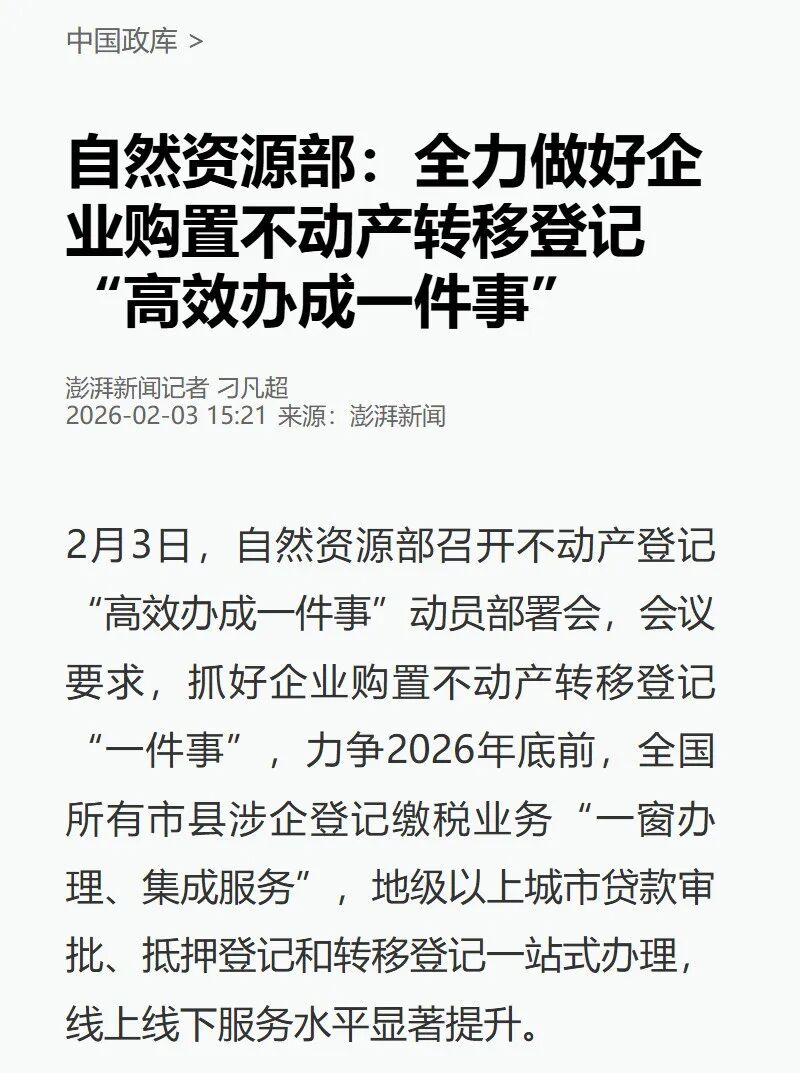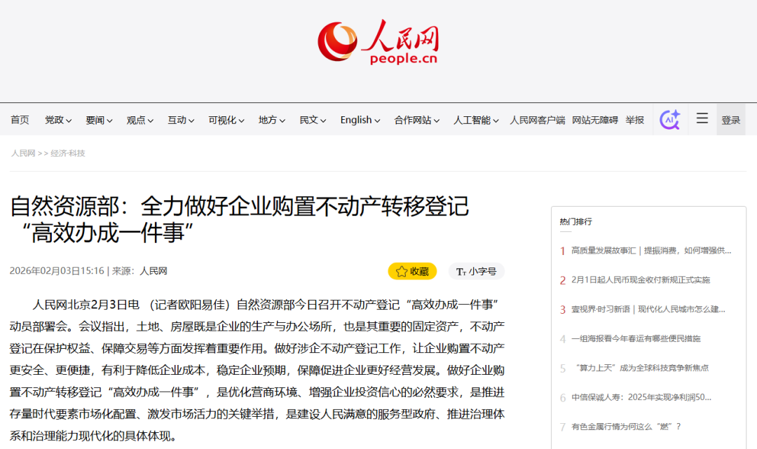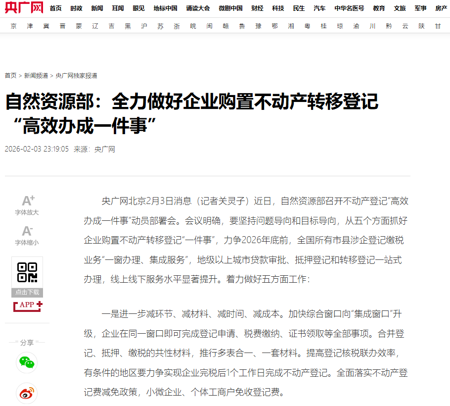 近日,自然资源部召开不动产登记“高效办成一件事”动员部署会,联合国务院办公厅政务办及公安、税务、市场监管、金融监管等部门,提出力争到2026年底前,全国所有市县涉企登记缴税业务实现“一窗办理、集成服务”,地级以上城市实现贷款审批、抵押登记和转移登记一站式办理。《人民日报》、人民网、人民网客户端、新华网、央广网、央广网客户端、《光明日报》客户端、中国日报网、中国新闻网、中国网、法治日报-法治网、《工人日报》客户端、《经济参政报》、澎湃客户端等媒体进行了报道。
