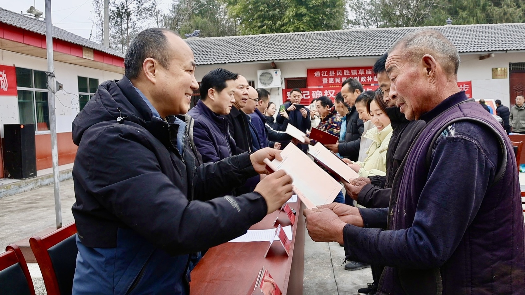 同一天,通江县农村“房地一体”集中颁证仪式在民胜镇草庙村同步举行。工作人员通过悬挂横幅、发放宣传手册、现场宣讲等方式,向村民全面解读农村房地一体确权登记的政策意义和登记范围,帮助村民深入理解确权登记对保障自身住房权益、助力乡村振兴的重要作用,让政策红利真正走进群众心里。