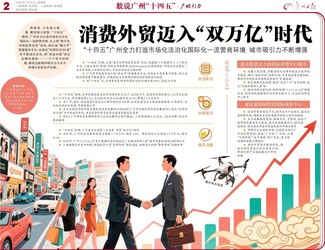 “十四五”时期,广州成为全国第三个消费、外贸“双万亿”城市。
