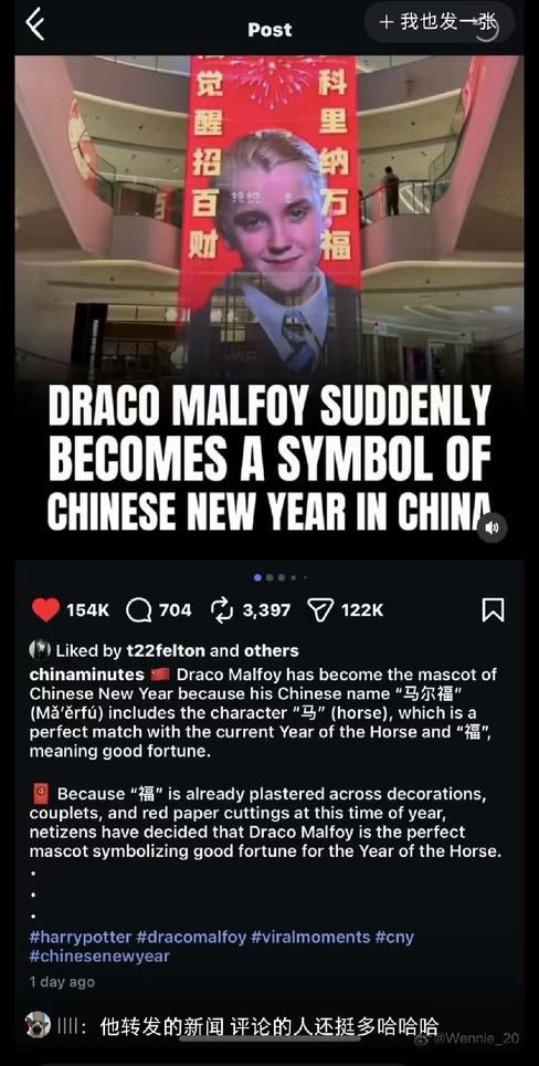 这一热梗在各大社交媒体上走红后,河南一家商场还贴上了同款电子海报,这一现象被电影《哈利·波特》中饰演马尔福的演员汤姆·费尔顿发现。他在自己的社交账号上点赞并且转发,并且被《泰晤士报》、BBC等欧美媒体报道。BBC称,“德拉科·马尔福成为中国好运的象征”。