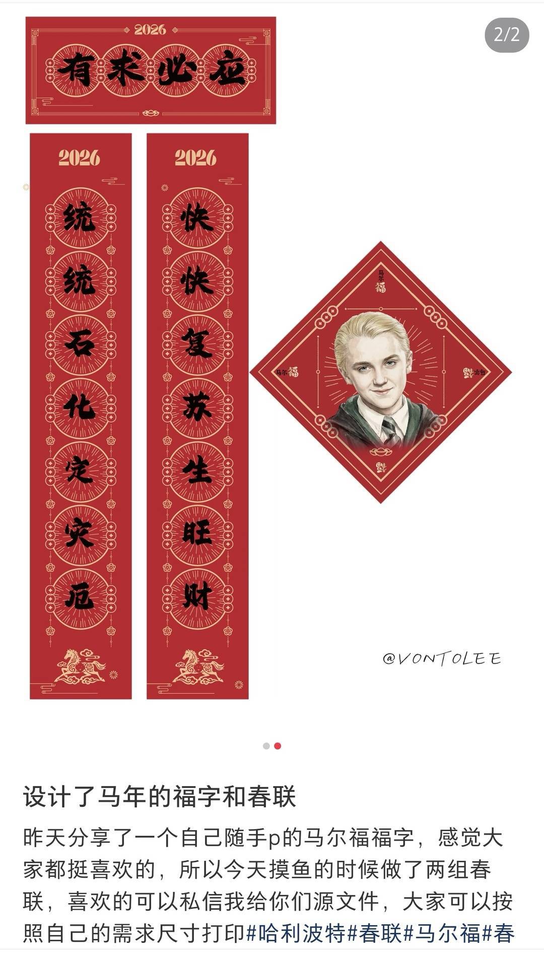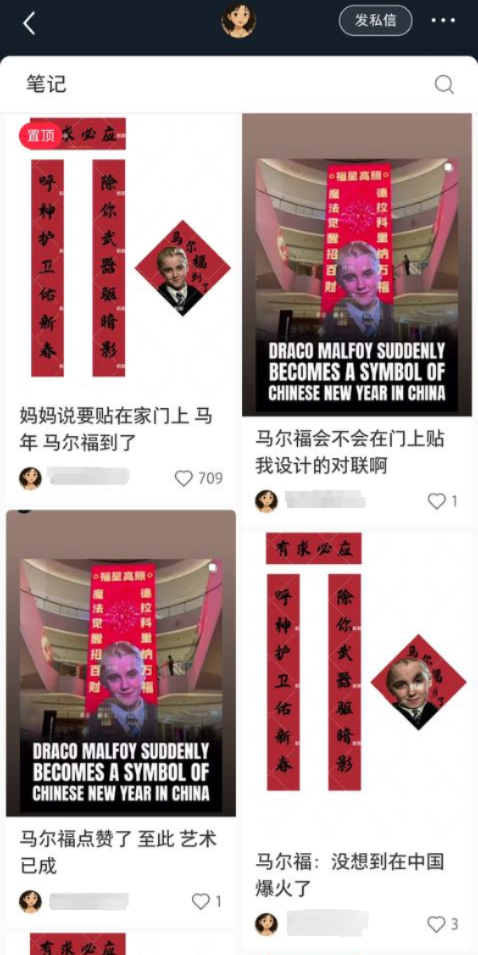 小红书是这款“邪修版”春联和福字最早出现的平台之一。网友“文刀李”是最早的创作者之一。他告诉封面新闻记者,1月下旬,他刚刚打完一款关于《哈利·波特》的游戏,然后重新开始刷《哈利·波特》的电影,想到马年要来了,随手用手机P了一张图。许多网友都来找他要源文件,想做成实物贴在家门口,于是他在网盘里上传了源文件,免费分享给网友:“两眼一睁就是复制粘贴。”他还劝网友不需要去平台上买,直接找个打印店打印,成本更低。