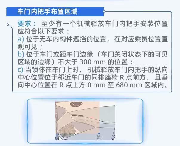 ● 每个车门(不含背门)必须配备机械释放装置。即使在发生不可逆约束装置展开(如气囊弹出)或动力电池热扩散(起火/冒烟)等极端事故后,车辆断电情况下,乘员和救援人员仍能通过物理方式手动开启车门。