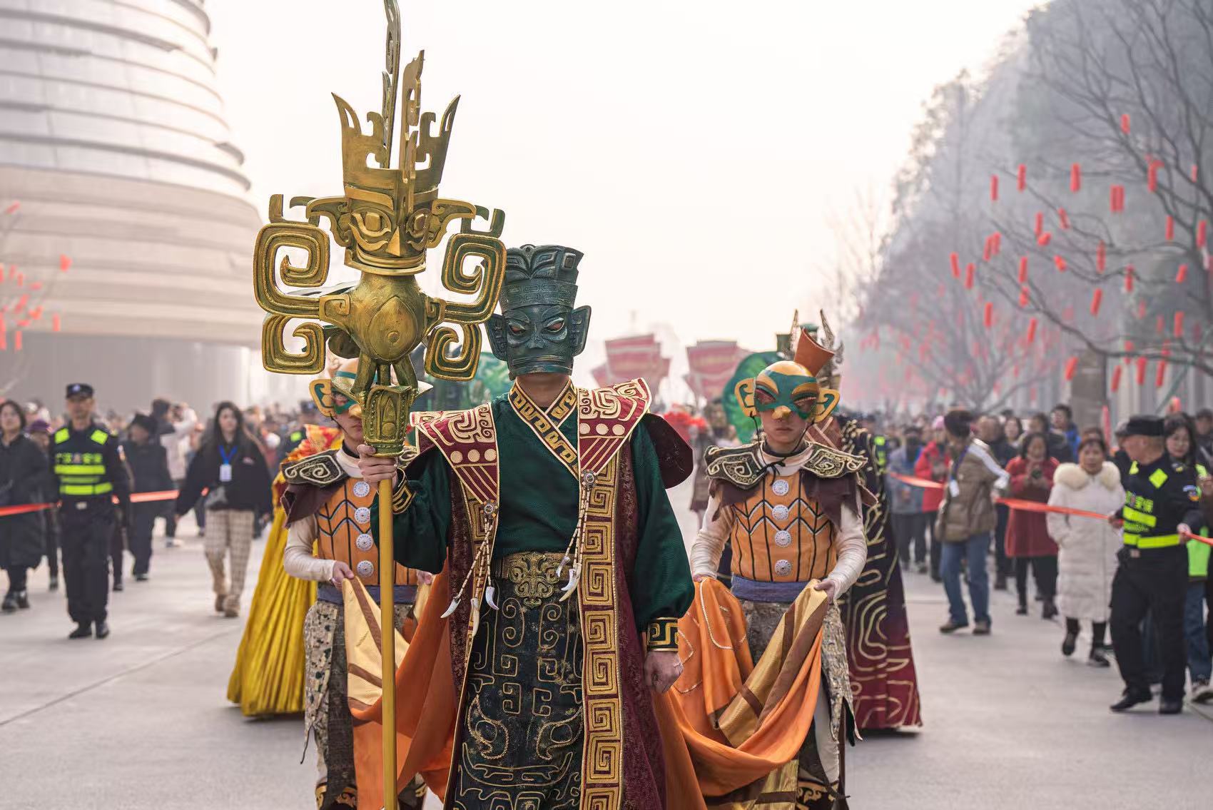 三星堆博物馆新年大典大型展演活动将从大年初一持续至初七。届时,古蜀的“祭司”们将带着青铜面具在馆内游行表演和祈福,邀请游客一同探索古蜀人恢弘的世界观和价值观。
