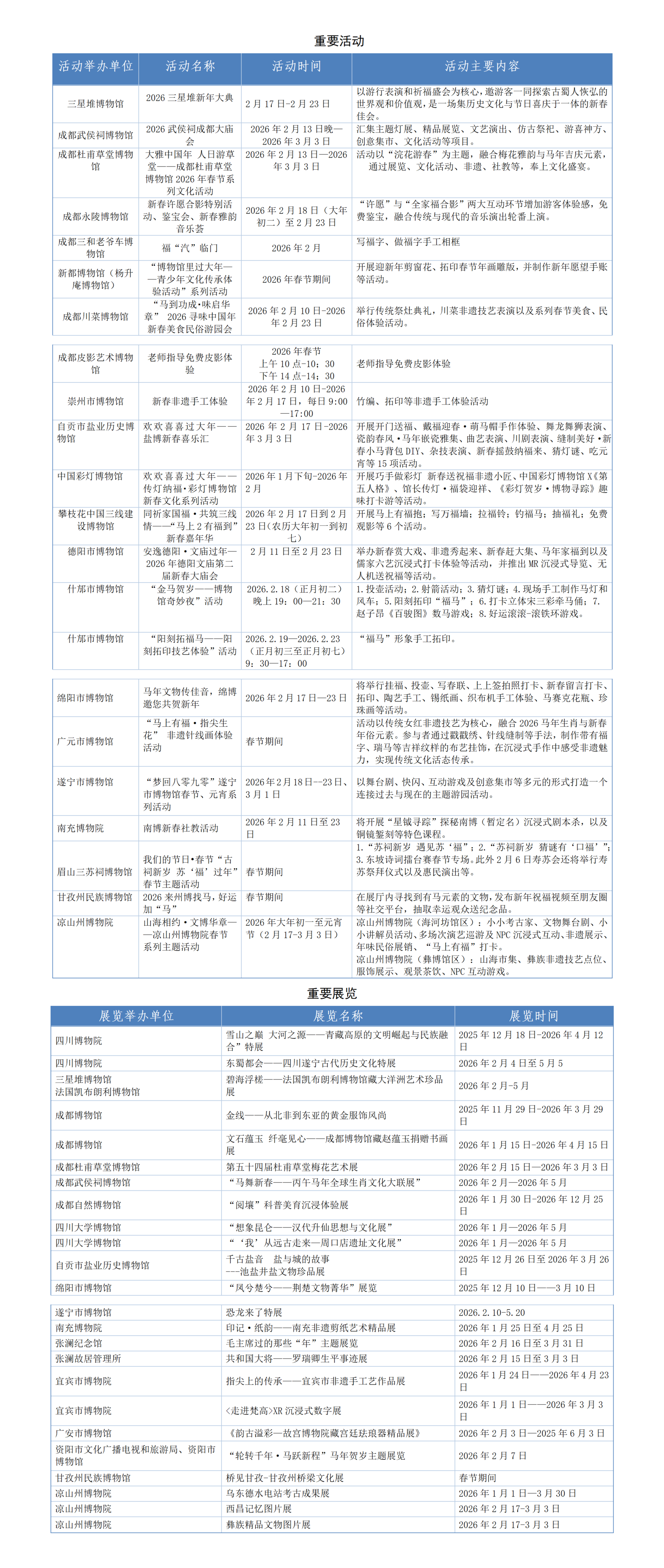 马年春节将至,四川各大博物馆在春节期间推出丰富多彩的文博大餐。除四川博物院的孔龙村遗址考古发掘阶段性成果展、《东蜀都会——四川遂宁古代历史文化特展》等多个新展近日陆续登台亮相后,三星堆新年大典、武侯祠成都大庙会以及“大雅中国年 人日游草堂”等多项活动也将精彩登场。据不完全统计,全省博物馆仅春节期间推出的新展就多达87个,各项活动99项。