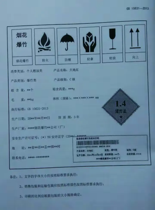 选购时需仔细查看烟花爆竹包装,确认包装上标注的信息完整无误,包括制造商名称及地址、含药量、警示语、燃放说明、生产日期、保质期、执行标准编号(如GB 10631-2013或GB 10631-2025《烟花爆竹安全与质量》)等基本信息,坚决不购买包装标识信息缺失、模糊不清的产品。