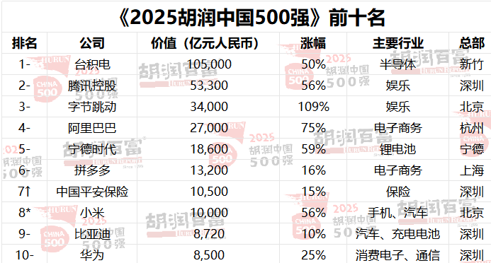 《2025胡润中国500强》TOP10企业。来源:胡润研究院。