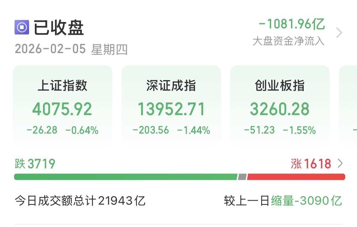2月5日,A股三大指数集体回调。截至收盘,沪指跌0.64%,收报4075.92点;深成指跌1.44%,收报13952.71点;创业板指跌1.55%,收报3260.28点。全市场成交额仅有21943亿元,较昨日缩量3090亿元。个股与指数齐跌,全市场超3700只个股下跌,1600余只个股上涨。