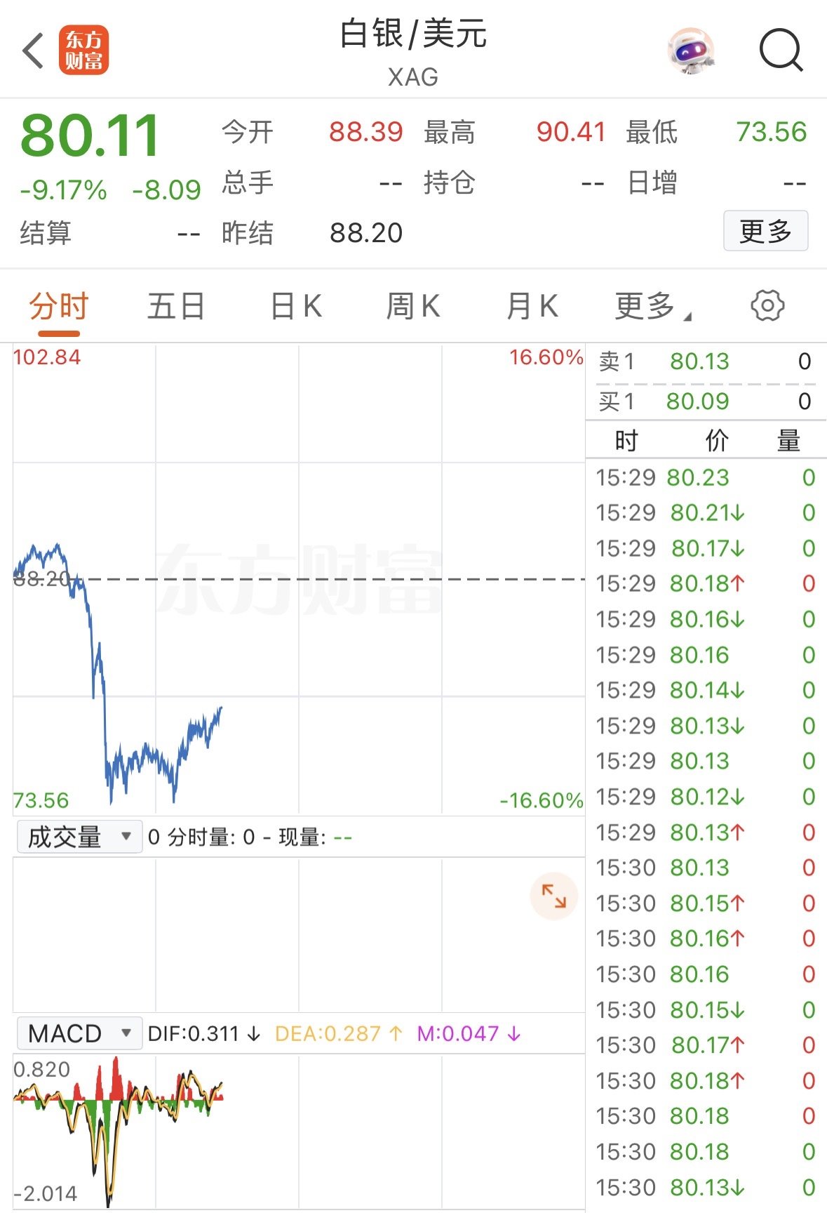 今日的市场上,贵金属板块走跌明显,白银、黄金同步下探,白银有色、湖南白银跌停,湖南黄金、四川黄金逼近跌停。消息面上,A股交易时段内,伦敦银价盘中跌幅超14%,从90美元/盎司的高点回落至74美元/盎司;黄金虽盘中跌破4900美元/盎司关口,但整体跌幅远温和于白银。