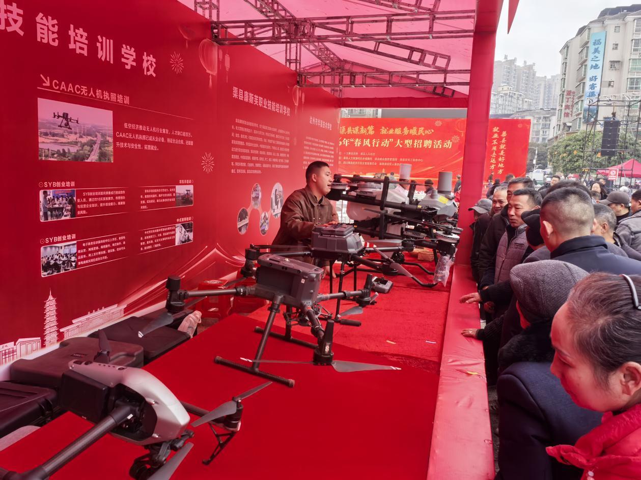 活动现场,除了密集的企业招聘展位,政策宣讲与技能培训专区同样人头攒动。 在技能培训区,无人机操作培训与展示吸引了众人驻足。教员手持设备,细致讲解着飞行原理与实操技巧,学员们则跃跃欲试。这一新兴技能的引入,不仅拓宽了求职者的能力边界,也映射出渠县产业升级与就业服务正向着更多元、更前沿的领域拓展,为劳动者“赋能”提供了新的可能。