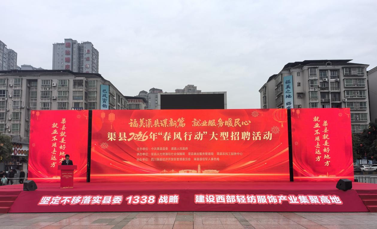 2月4日,清晨的薄雾还未散尽,渠县万兴广场已是人声鼎沸。一场以“轻纺进万家·穿在渠县”暨2026年“春风行动”为主题的大型招聘活动,在这片承载着千年纺织记忆的土地上启幕。上午10时许,渠县县委书记刘伟宣布活动正式启动。