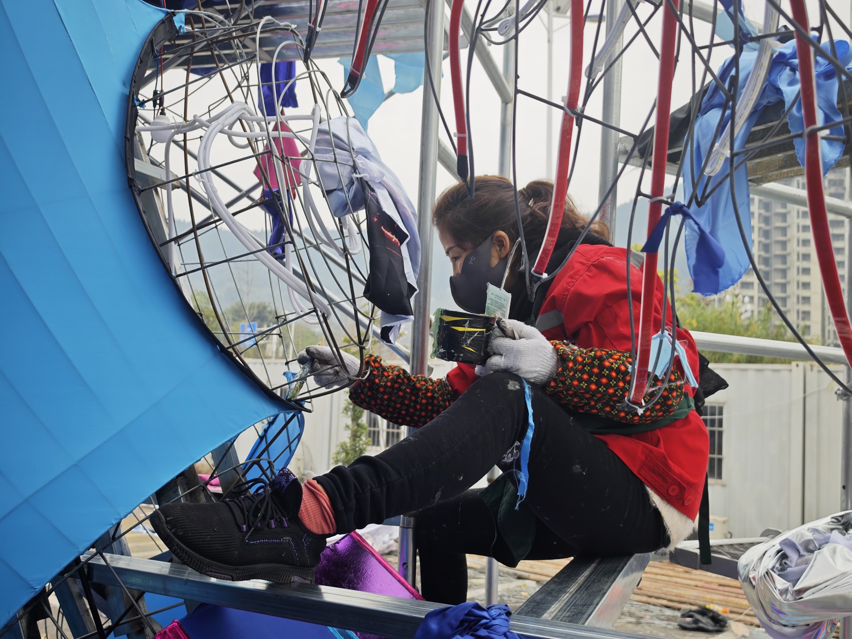 有着10余年彩灯制作经验的林大姐正在有条不紊地做着裱糊工作,只见她手法娴熟地规划着每一片绸布该粘贴的位置。“我们都是自贡人,大多数都有10年以上的彩灯制作经验,不需要看图纸就知道每个位置粘什么颜色的布料。”林大姐她指着刚完工的狮子爪说道,“做彩灯是慢工出细活,就这一个爪子我们4个人就做了三四个小时。”
