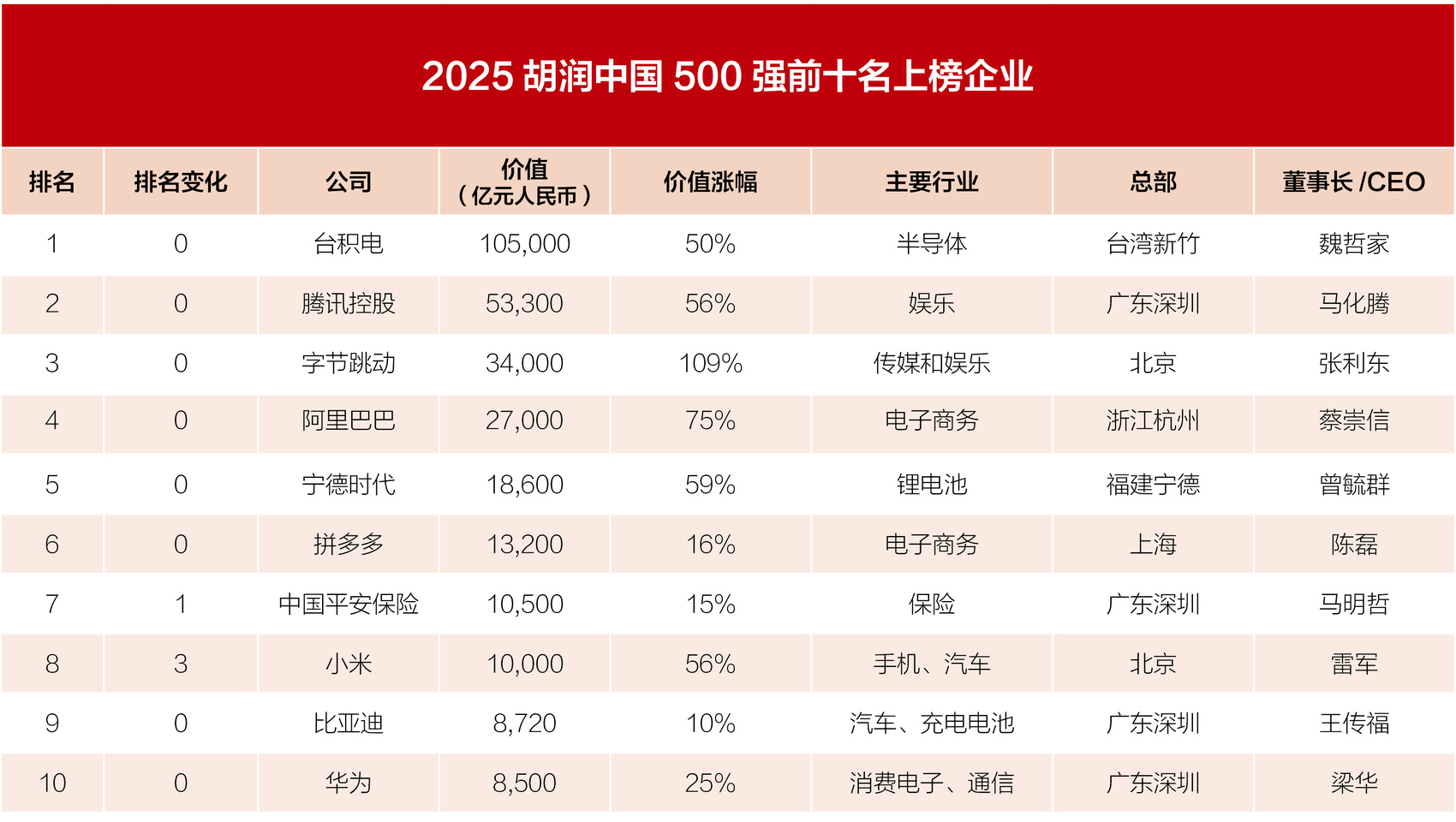 附《2025胡润中国500强》前100名榜单: