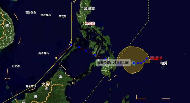 今年第2号台风“西望洋”(热带风暴级;英文名称:Penha;名字来源:中国澳门;名称意义:西望洋山,澳门新八景之一)于2月4日20时在菲律宾以东洋面生成。5日08时中心位于北纬8.0度、东经129.5度,即菲律宾马尼拉东南方向约1180公里的洋面上,中心附近最大风力有8级(18米/秒),中心最低气压为998百帕,七级风圈半径为180-320公里。预计,“西望洋”将以每小时20-25公里的速度向偏西方向移动,强度将有所加强,将于今天夜间在菲律宾东南部沿海登陆。之后穿过菲律宾中南部,将于8日移入南海东南部偏东海域,强度将明显减弱。该台风对于海南岛陆地及周边近海、西中沙群岛附近海面无影响。