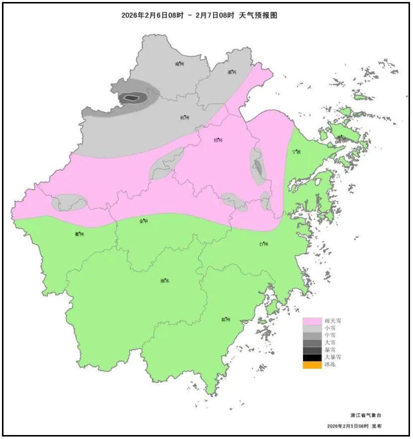 雨(雪)预报:明天(6日)降水较明显,浙北地区部分中雨局部大雨。明天中午起自北而南有一次雨雪转换过程。浙北山区率先转雨夹雪或雪,部分中大雪,高山区局部暴雪;下午起浙北部分平原地区有雨夹雪,傍晚起雨夹雪或雪;夜里至7日早晨浙中地区和浙南山区部分雨转雨夹雪或雪,其中浙西南山区局部有冻雨。7日中午全省雨(雪)止。