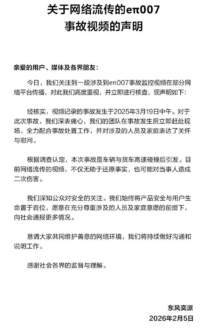 2月5日,东风奕派发布关于网络流传的eπ007事故视频的声明。