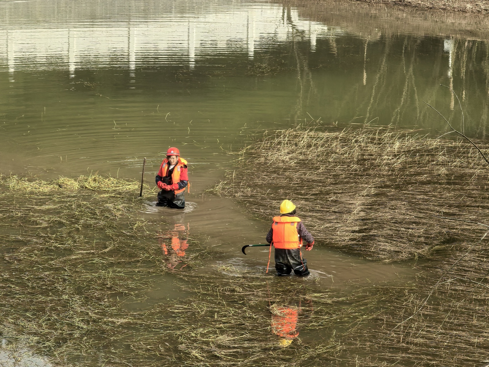 工作人员清理百草园堰塘里的水草。严佳敏 摄