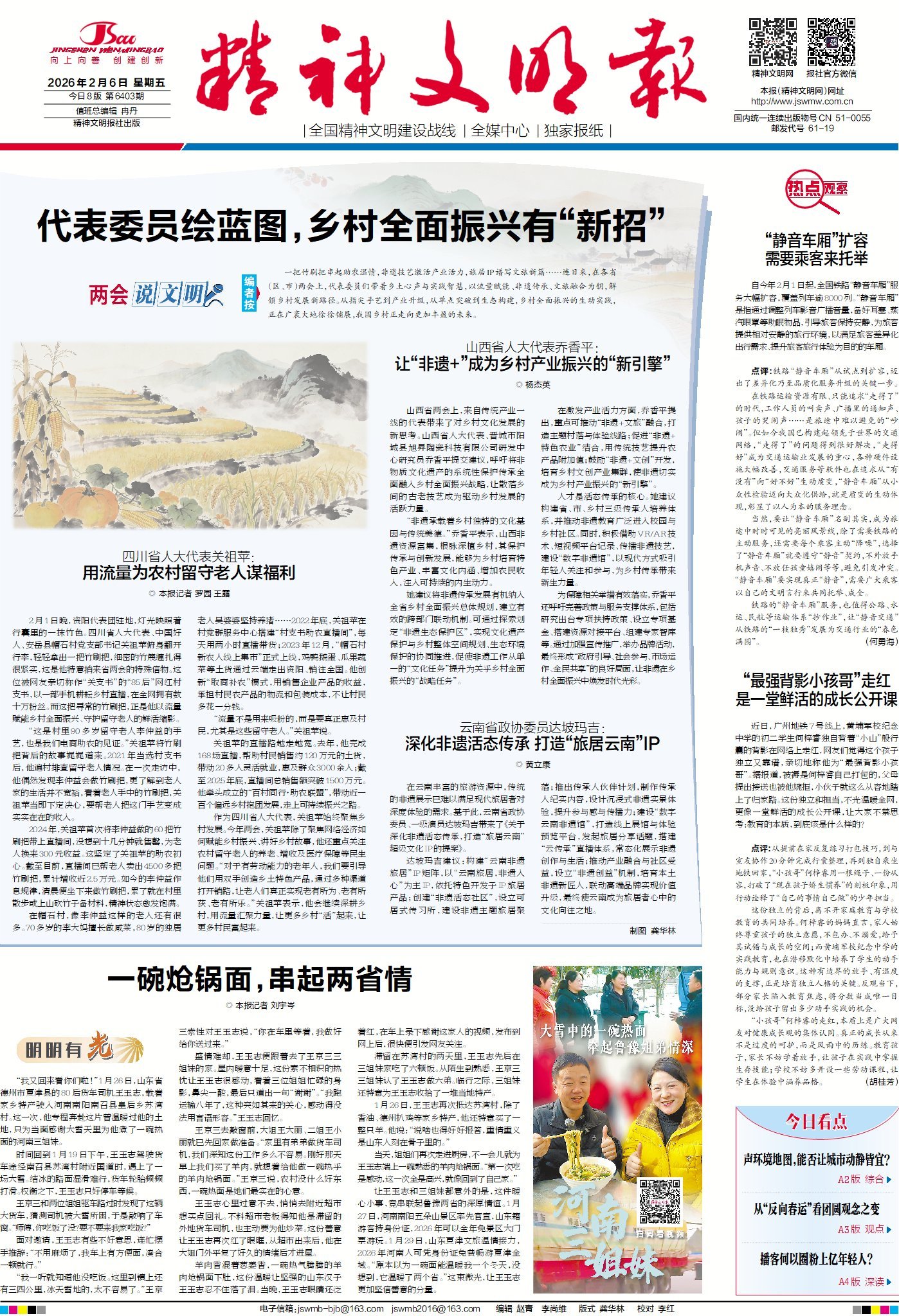 一把“竹刷把”串起助农温情,非遗技艺激活产业活力,旅居IP谱写文旅新篇……连日来,在各省(区、市)两会上,代表委员们带着乡土心声与实践智慧,解锁乡村发展新路径。走进今日A1版,一起看乡村全面振兴有啥“新招”。
